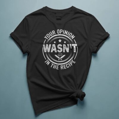 Funny chef graphic t-shirt with “Your Opinion Wasn’t in the Recipe” statement. Perfect for cooks, bakers, and kitchen pros who like to keep control in the kitchen.