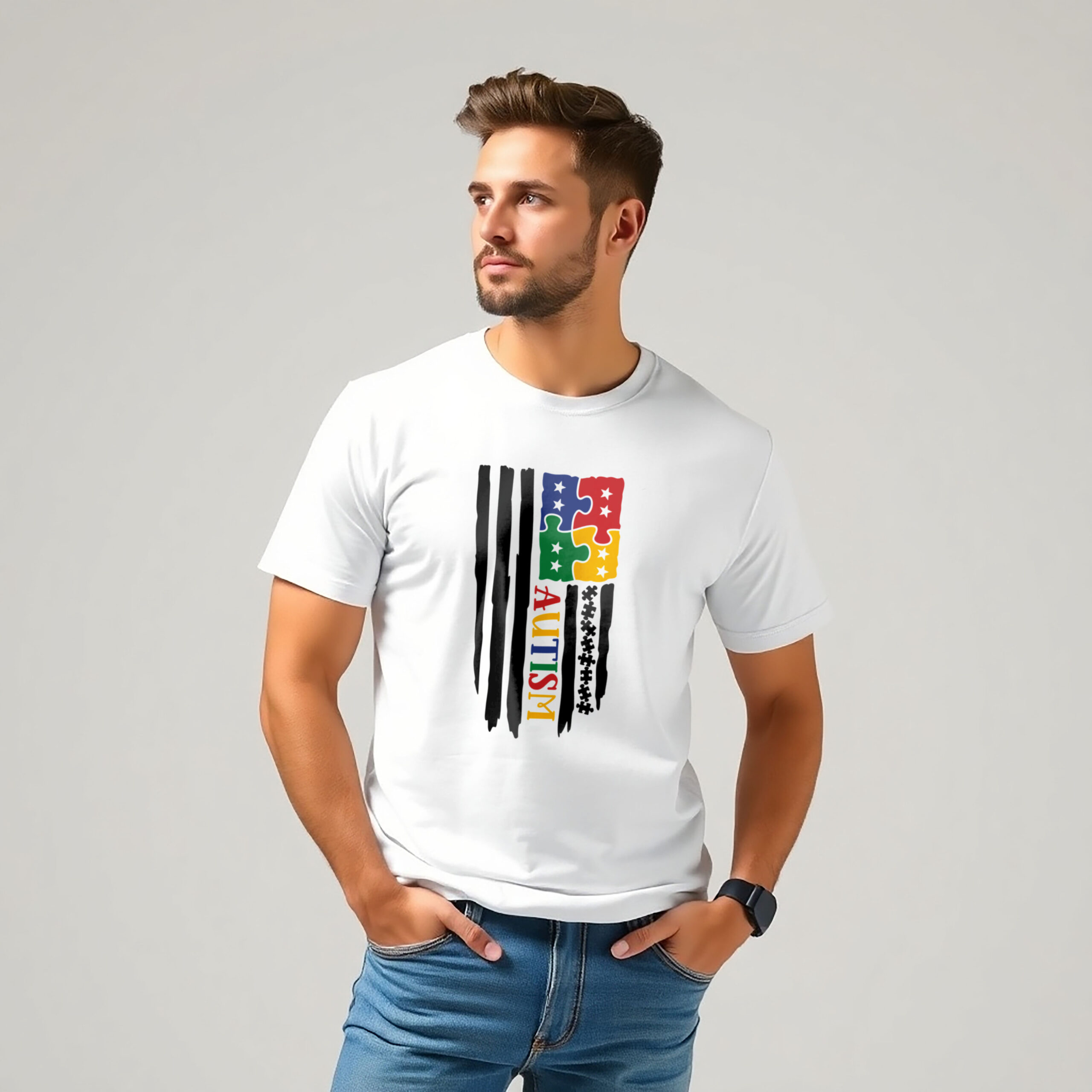 Bold, meaningful, and full of pride — this Autism Awareness tee combines the strength of the flag with the power of the puzzle piece. Featuring a distressed black-and-white flag with a vibrant puzzle piece design, it’s a perfect way to honor and support autism awareness in style.