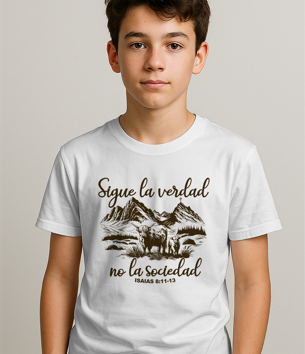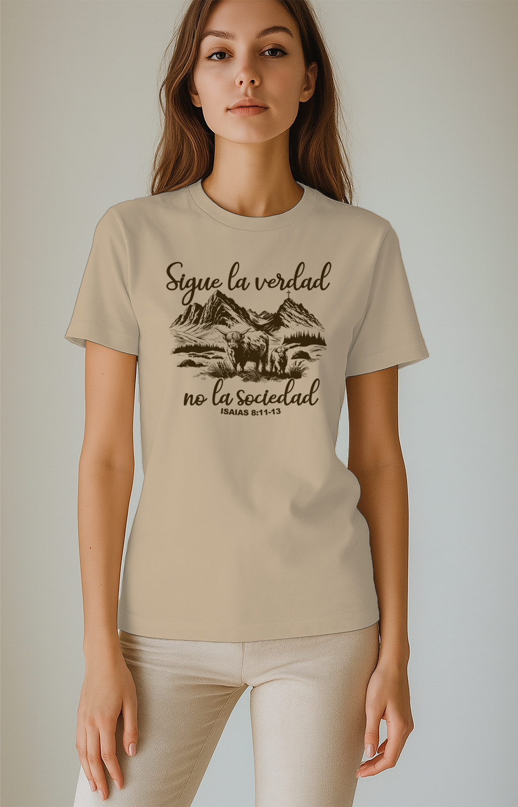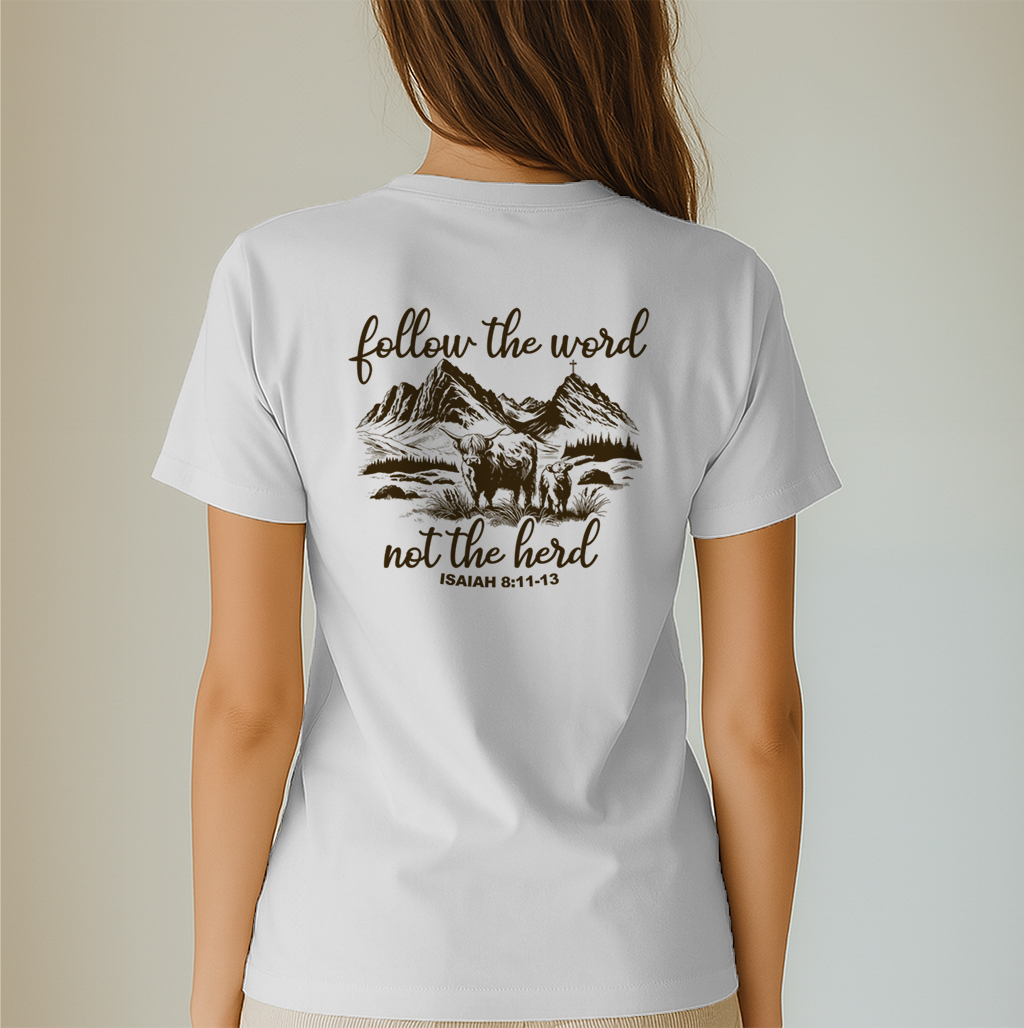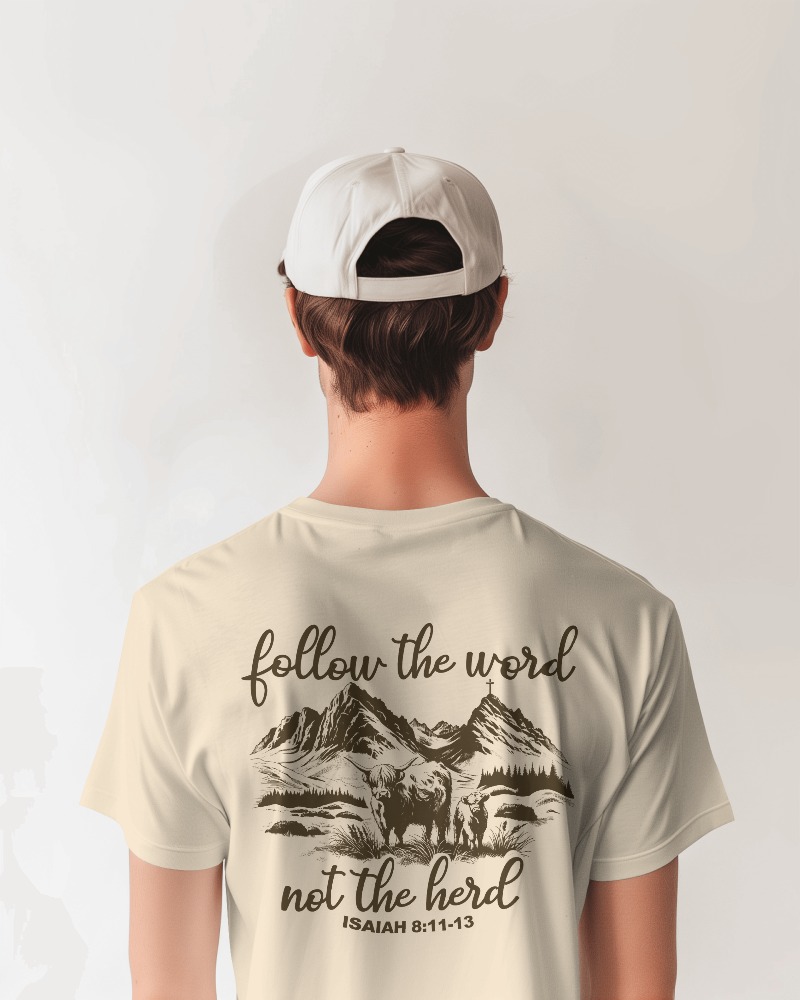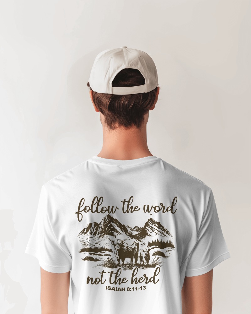 Stand firm in faith with this bold and meaningful design inspired by Isaiah 8:11-13. Featuring detailed artwork of mountains, cattle, and the cross, this shirt carries a powerful reminder: “Follow the Word, not the herd.”