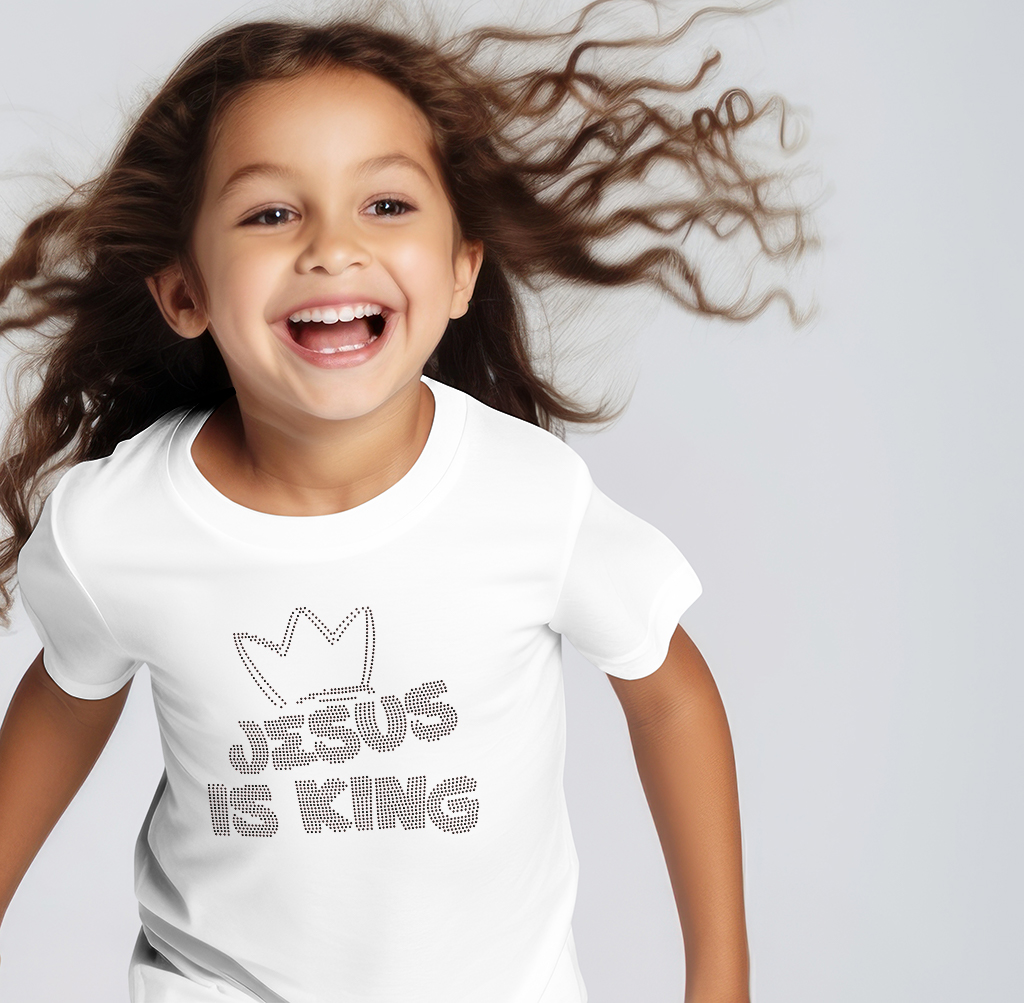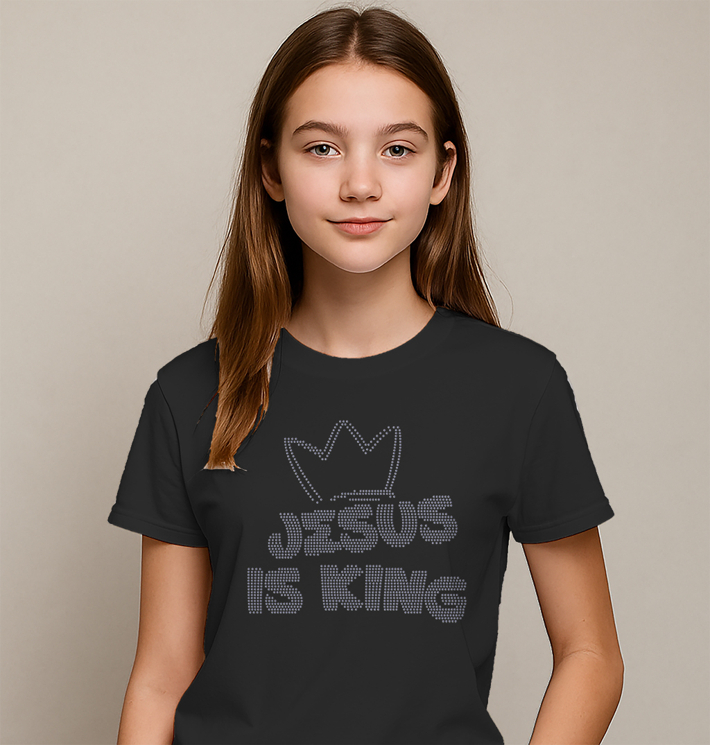 Shine your faith in style with this bold black t-shirt featuring dazzling rhinestones that spell out “Jesus Is King” with a regal crown above. Crafted for comfort and sparkle, this tee is perfect for worship, weekend wear, or sharing your faith out loud.