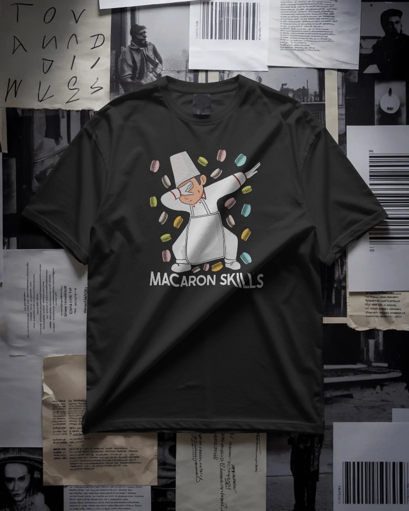 Creative chef graphic t-shirt featuring a playful macaron-themed design. Perfect for pastry chefs, bakers, and dessert lovers who want to show off their skills in style.