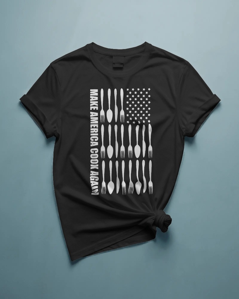 Patriotic cooking graphic t-shirt featuring utensil flag design and bold statement. Perfect for chefs, home cooks, and food lovers who enjoy mixing humor with kitchen pride.