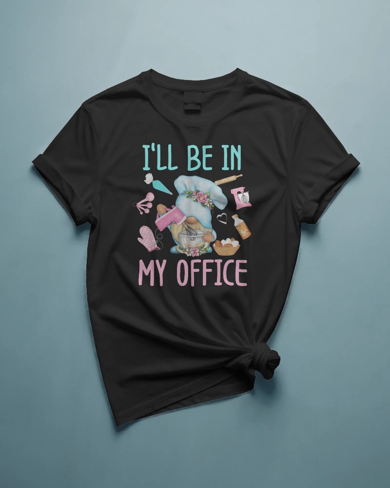 Cute baking-themed graphic t-shirt featuring kitchen tools and “I’ll Be in My Office” quote. Perfect for bakers, home cooks, and dessert lovers who feel at home in the kitchen.