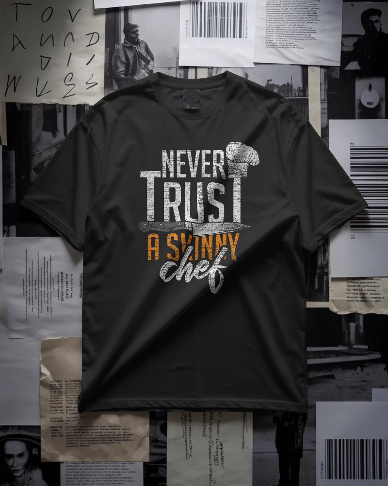 Funny chef graphic t-shirt with “Never Trust a Skinny Chef” statement. Perfect for cooks, food lovers, and anyone who appreciates bold kitchen humor—great gift idea for chefs.