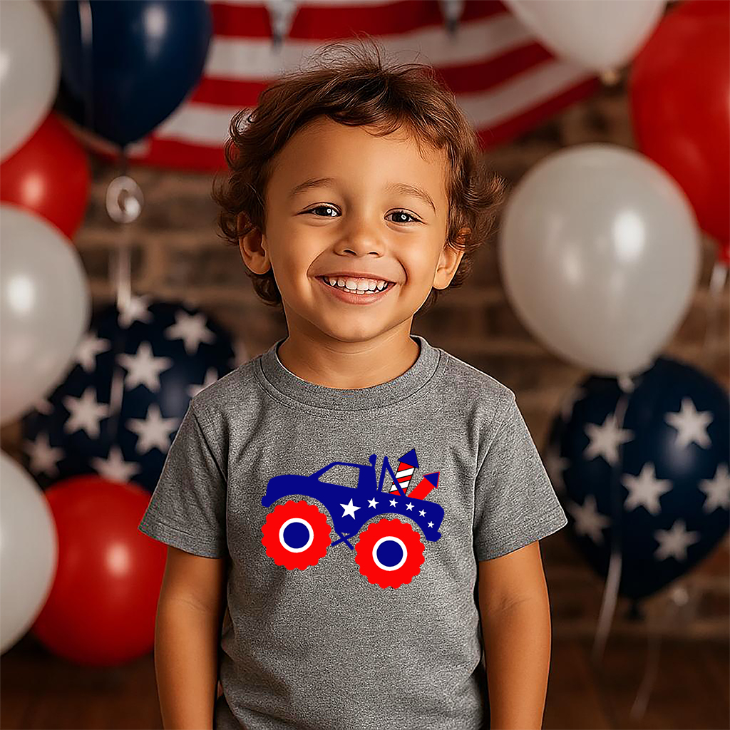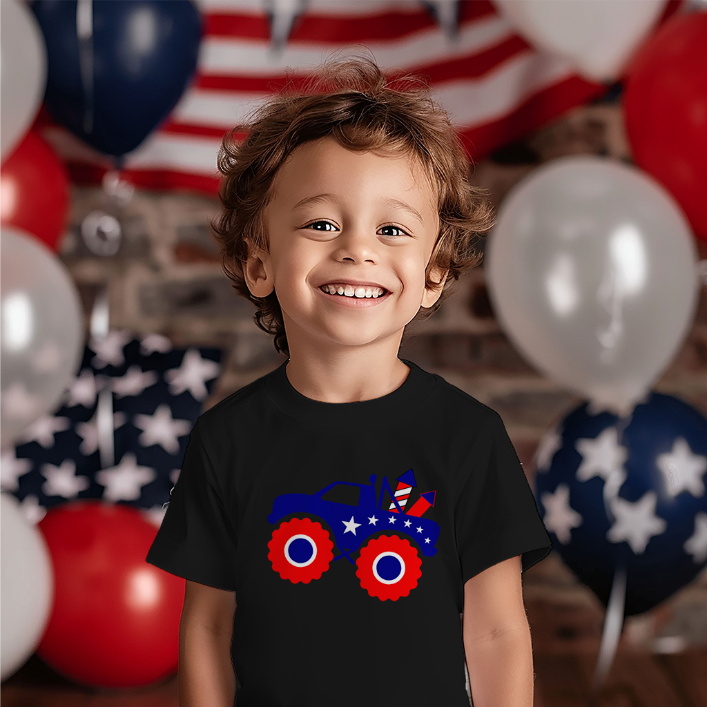 Let your little one roll into the 4th of July with BIG style! 🇺🇸 This Patriotic Monster Truck Tee is perfect for kids who love trucks, fireworks, and all things red, white, and blue. Featuring a bold and fun monster truck loaded with rockets and stars, it’s a festive favorite for parades, BBQs, and family photos. Soft, comfy, and bursting with USA pride!