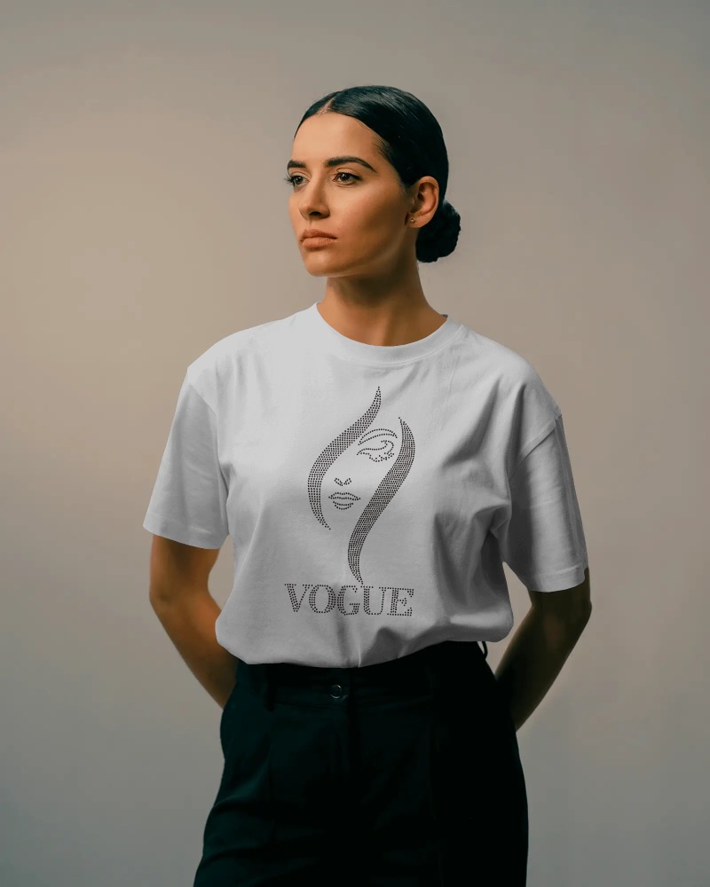 Each VOGUE letter is beautifully adorned with shimmering rhinestones, catching the light and attention wherever you go. Crafted from premium cotton, this tee offers a soft, breathable feel and a flattering fit that moves with you — perfect for both casual days and nights out.